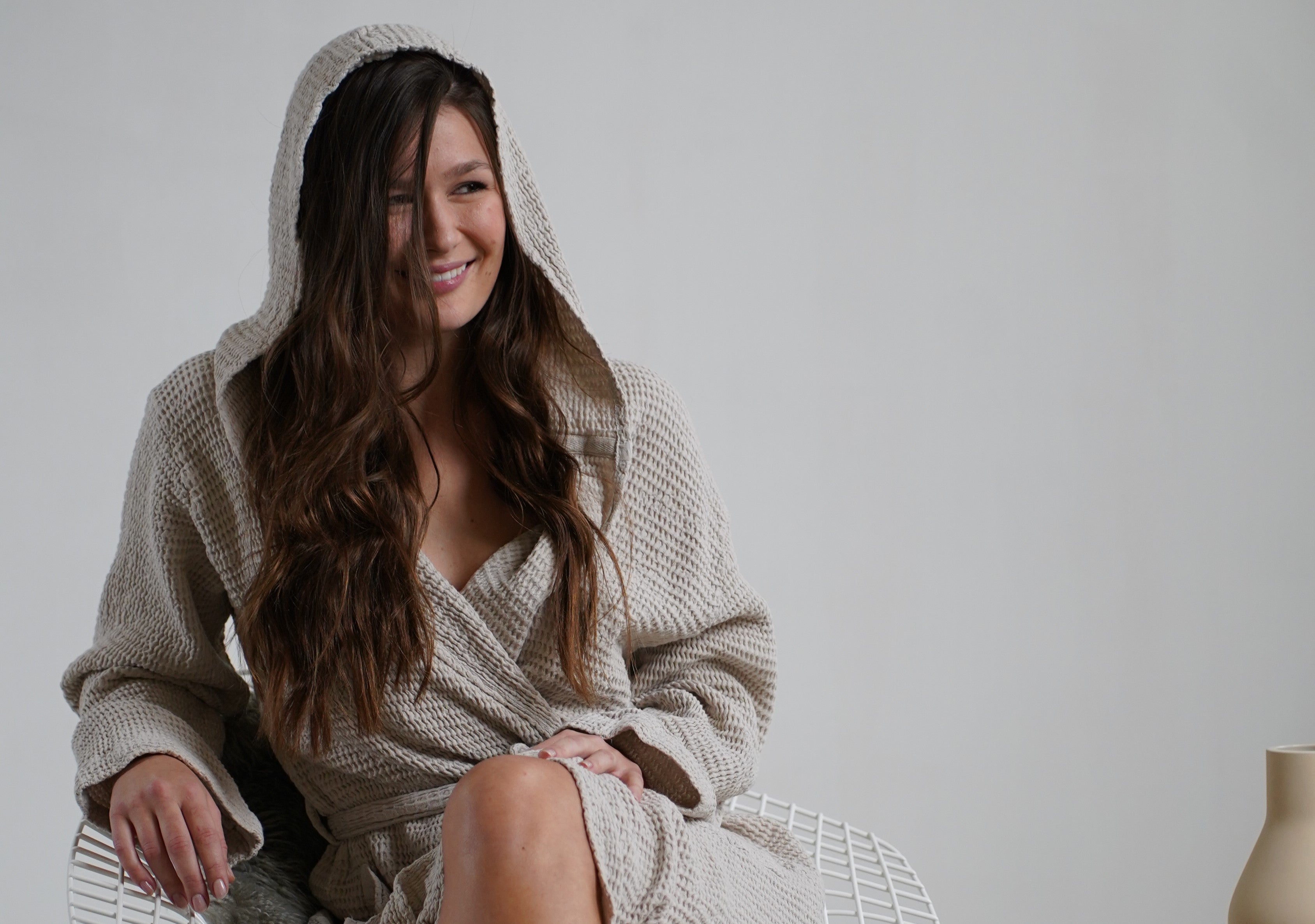 Unsere Loungewear-Produkte sind nicht nur zum Baden und für den Saunabereich konzipiert. Ziehen Sie unsere Mäntel nach der morgendlichen Dusche an, genießen Sie den Kaffee auf der Terrasse und ziehen Sie ihn erst zu Mittag wieder aus.